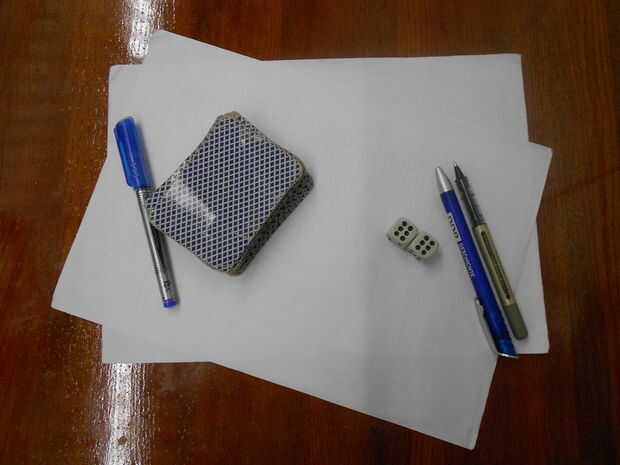 Si no tienes dados, utilizar una aplicación, o dos veces (con reemplazo) de una pila de cartas que contiene un Ace-2-3-4-5-6. También me gusta jugar a que, dos veces, todo el mundo grita un número y grabar el resto después de dividir por seis, pero no puedo decir si es verdaderamente aleatorio. Aunque es divertido.