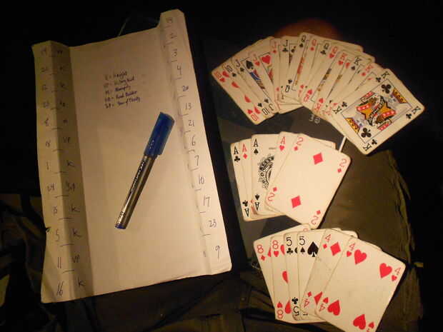 Doblar una página como se muestra a la izquierda, y con uno jugador sorteo 25 las celdas vacías. Tiene él o ella distribuir el 14 'caballero', 'Punto 5 de la victoria', 2 'Road Builder', 2 'monopolio' y 2 'Año de la abundancia' tarjetas de pseudo-al azar entre las células ocultas. Tener otro jugador, sin leerlo, pseudo-aleatoriamente asignar a cada célula de cierre doblado un número y, si eres paranoico o pedante, que ser el tercer jugador que se esconde, se rasga hacia fuera y distribuye las células cuando son necesarios.