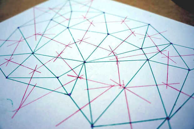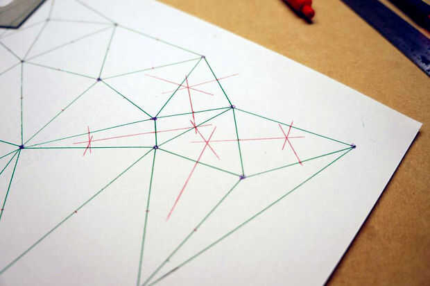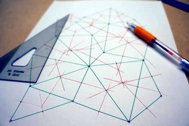 Utilizando la Plaza y del mismo color que utiliza para marcar los puntos medios, dibuje una línea a través de cada punto medio y perpendicular a la línea divide en dos. Estas son las líneas que forman los límites del patrón Voronoi.