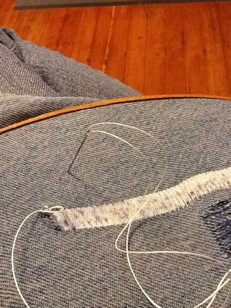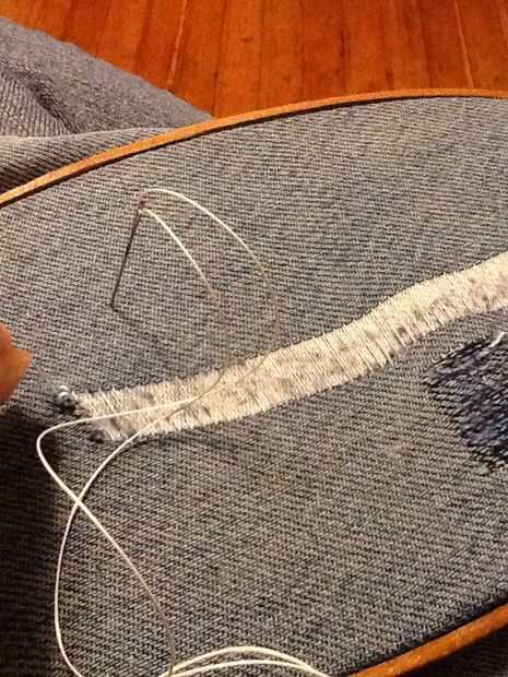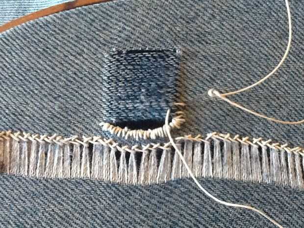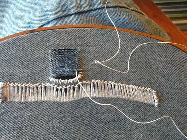 Enhebrar la aguja y hacer un pequeño nudo. Entrando por el lado equivocado de la tela, coser en el borde de corte de un extremo. Utilizar una puntada del agujero de botón (puntadas pequeñas juntas para cubrir completamente el borde cortado para que no debilite)