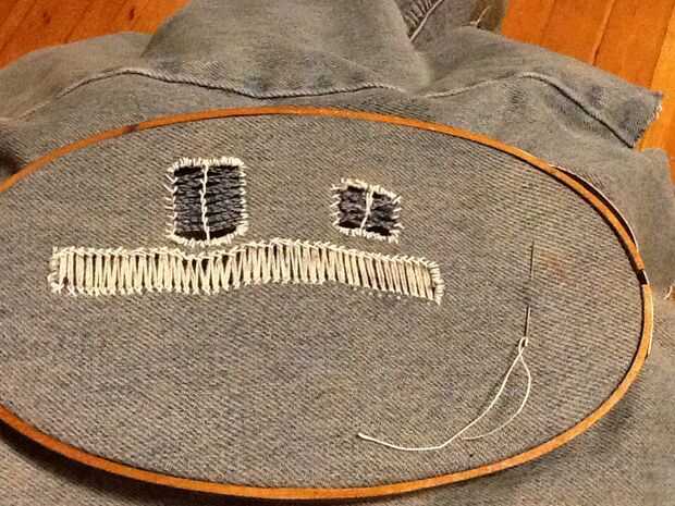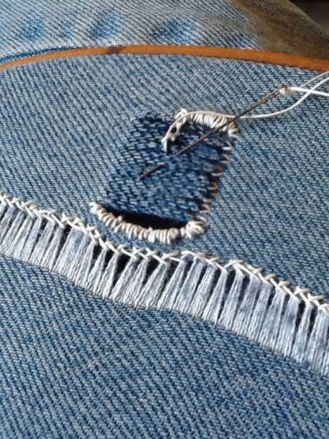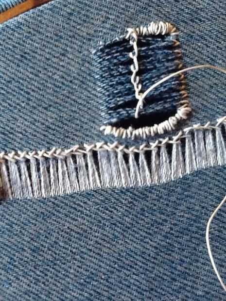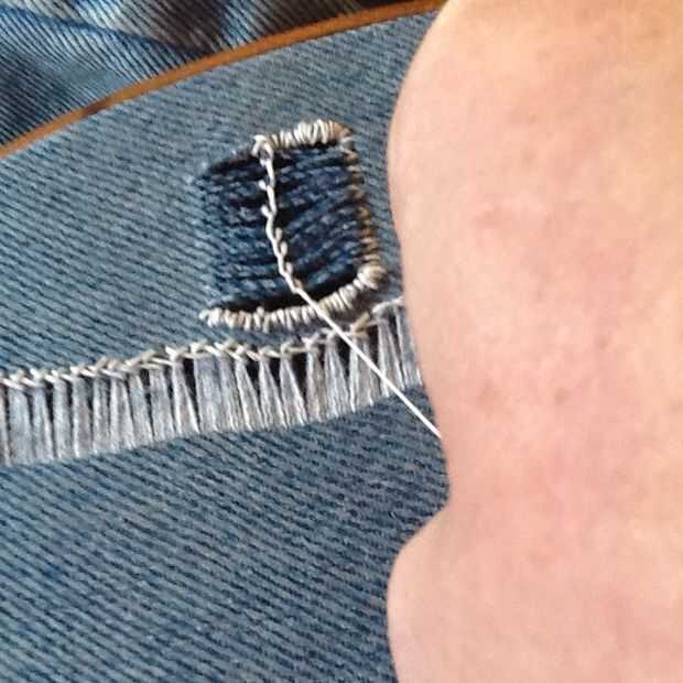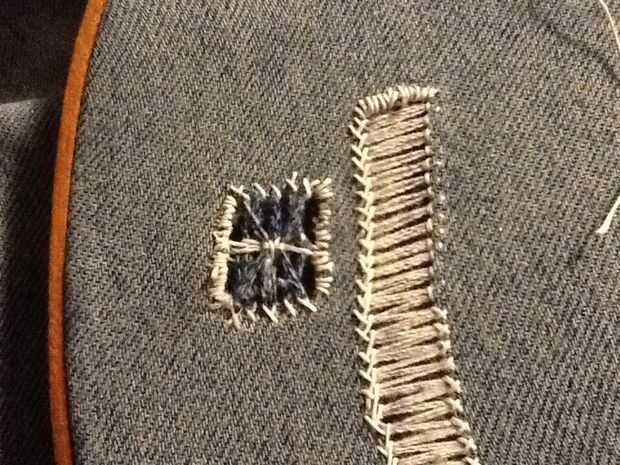 Comenzando en el centro de un extremo cortado, traer la aguja alrededor de un conjunto de hilos de rosca de la parte delantera de la tela y luego pasar atrás y hacia fuera otra vez en el frente. Luego ejecute la aguja en el primer bit del hilo de la aguja, hacer un nudo del resbalón de clases. Continuar por el resto de la Plaza de la misma manera, una serie de nudos corredizos, mantener la tensión del hilo a medida que avanza. Esto puede hacerse para crear barras o patrones de v en la obra abierta.