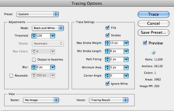 También puede utilizar la interfaz de calco para controlar diferentes variables para alterar el aspecto. Para llegar a la interfaz, ir a objeto > Calco > Opciones de rastreo
