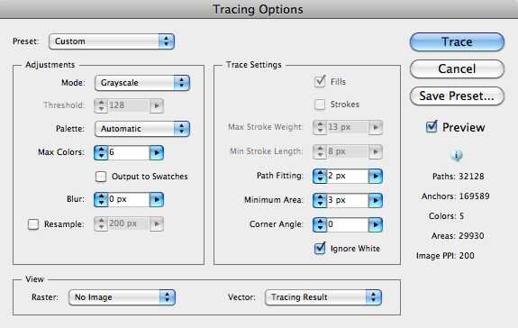 Algo para notar aquí es que con cualquiera de estas opciones, blanco y negro o escala de grises, el número de caminos creada por calco es enorme. En la versión blanco y negro, hay 11.000 + y en los caminos de escala de grises 32.000 + creados. Si esto fuera algo que aún necesita para editar, la cantidad de capas solo podría ser difícil de vadear. Esto puede ser cuando es necesario utilizar la herramienta pluma.