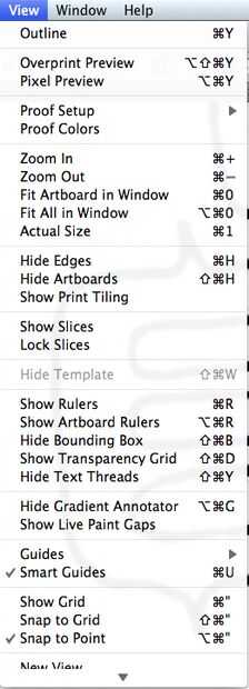 Para utilizar este método, importar el archivo a la mesa de trabajo. Si no estás cómodo en Illustrator, puede ayudar a activar las guías inteligentes bajo vista > Guías inteligentes. Haga clic para obtener más información sobre guías inteligentes: http://livedocs.adobe.com/en_US/Illustrator/13.0/help.html?content=WS714a382cdf7d304e7e07d0100196cbc5f-6314.html