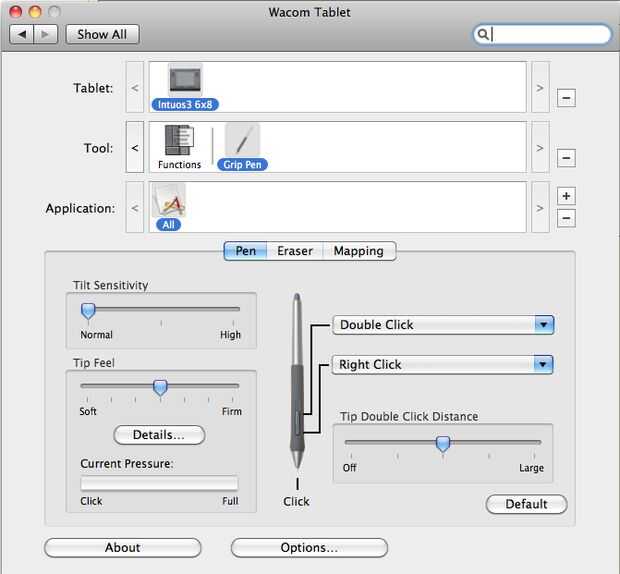 Una de las mejores cosas que puede hacer para ayudar a su flujo de trabajo es utilizar los botones en el lado de la pluma. Si vas al panel de preferencias de la tableta Wacom en las preferencias del sistema, puede hacerlo. Nosotros tenemos configurar click derecho en el botón inferior y haga doble clic en el botón superior. Ver la foto en este sistema para obtener más información.