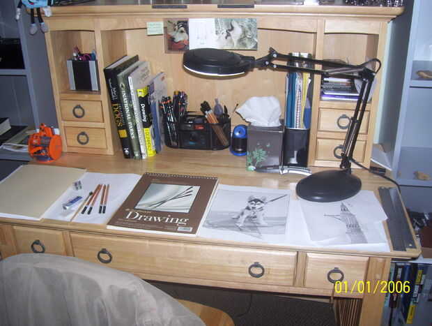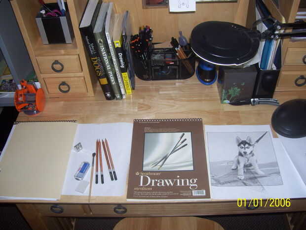 Bien, pues si su suerte tendrás un escritorio para dedicarse al dibujo. Tengo tres 'escritorios', uno es un escritorio de la escuela (yo educo en el hogar), la segunda es más de un banco de trabajo que abajo en la sala del horno y mi tercera es uno que tengo en mi habitación. Por un tiempo, sólo llevaba todo mi dibujo 'equipo' en una bolsa ziploc grande, que era, hasta que dejé de escribir mis historias en papel y pasó a escribir en la computadora. Una vez que lo hice, tenía un escritorio completo para dedicarse al dibujo. Como se puede ver, abajo tengo un puñado de fotos de mi mesa de dibujo todo configurado y listo para comenzar a dibujar mi foto de Siberian Husky.