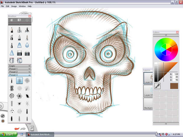 este es mi video de mi dibujo de un cráneo simple con software de Sketchbook pro gratis demo. Nunca usé este tipo de software. Usando un ratón era más difícil de lo que pensaba. Una vez que conseguí empecé me gusto mucho lo. Creo que lo usaré de ahor