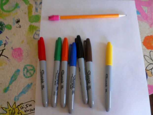 Sharpie de rojo, verde, naranja, azul, negro, marrón y amarillo