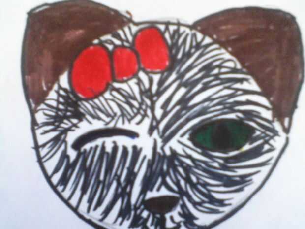 Color de las orejas con rotulador marrón.  El ojo de color verde, luego poner amarillo sobre el verde.  Esto hace más brillante y le ayudan más.  En el centro del ojo color negro.  Delinear el arco con el negro, y color rojo.  Ir sobre el guiño ojo con azul, y la boca con azul, esto les ayudará destacar y no perderse en la piel.