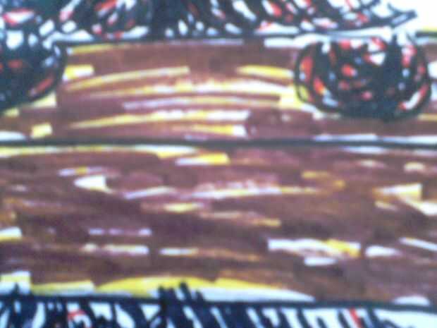 Go sobre el lápiz líneas sobre la viga con el negro, puede utilizar una regla :)  De color marrón con líneas rectas, dejando algo de espacio entre las líneas de la viga.  Rellene los espacios con líneas amarillas, esto hace que la madera parezca más natural.