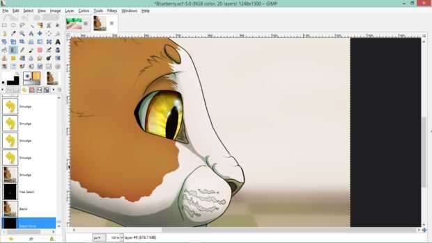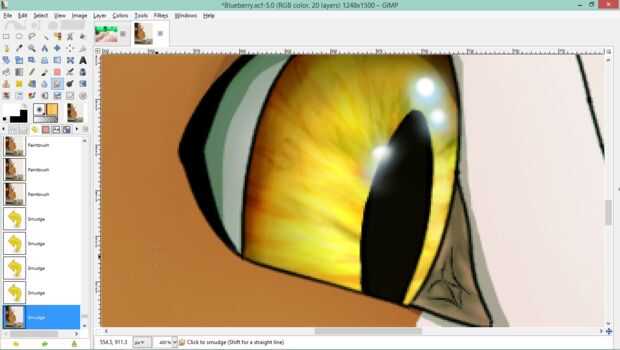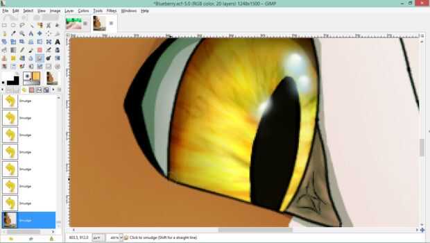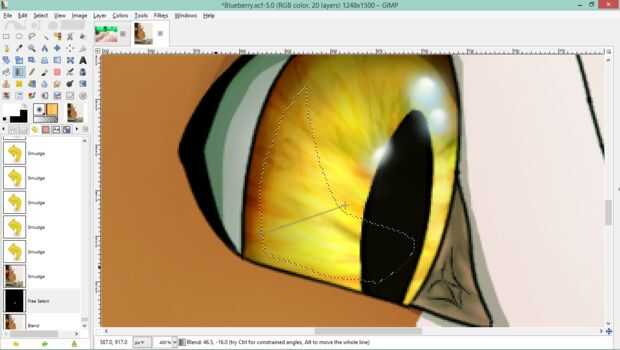 Aerografo unas iluminación ambiental para el fondo (en una capa nueva). Ajuste el modo de capa ' esquivar '. En otra capa nueva (sobre todo) dibujar algunos aspectos destacados con azul claro, luego añadir algo de blanco para ellos. Utilice la herramienta dedo para hacer que parezca más natural. Seleccione una forma de cuña en la parte inferior del ojo y utilizar la herramienta degradada con la opacidad a alrededor de 40 para darle un brillo reflectante.