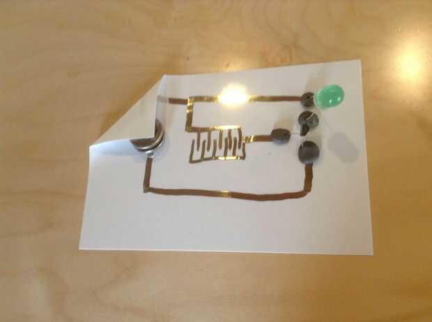 Cuando se toca el patrón en el medio, la piel termina un circuito. La corriente que pasa a través de su piel sería insuficiente para encender un LED, así que usamos un transistor para amplificar la corriente a un nivel que puede encender la luz.