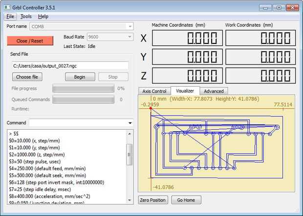 El programa que irá trasladando las órdenes en G-Code una llama de nuestra placa por USB se GRBLcontroller, muy fácil de utilizar.