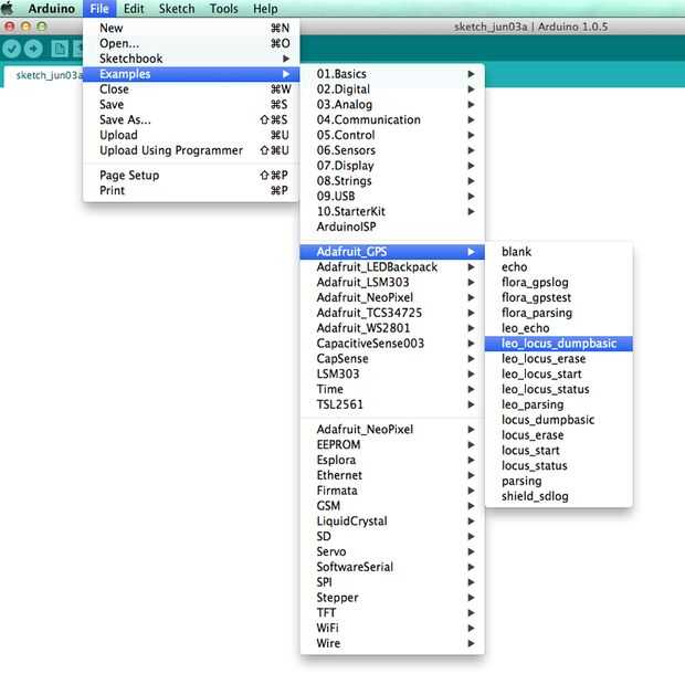 Vamos a cargar el programa que transmitirá el registro almacenado en el módulo GPS a la computadora sobre la serie. FLORA de conectar por el puerto USB y cargar el ejemplo de leo_locus_dumpbasic Codebender