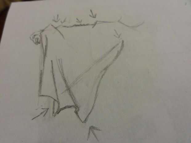 Hora de agregar el paño que fluye en la parte inferior.  Mira la flecha que apunta a la tela que fluye.  Si eres nuevo en el concepto de que la tela, dibujar algunos boca abajo ' de C  Ahora a darle algunos 'profundidad' o capas para que no se ve plana.  Si la curva de la 'C' va en profundidad suficiente, añadir una línea.  Probablemente parece muy extraño ahora mismo pero no te preocupes.  A continuación, seleccione un punto donde cuelga su trapo de.  Abstenerse de elegir lugares en el codo o el antebrazo.  Elija lugares cerca de la muñeca o en la axila.  Elegí un punto cerca de la muñeca.  Agregar líneas que conectan el extremo más alejado de la ' C que marcó.  Recuerde,
