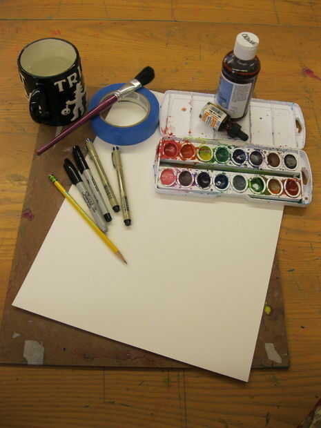 Buen tamaño hoja de papel de acuarela, tablero ligero (si tienes un bloque acuarela no necesita la tarjeta o cinta) cinta, me gusta usar acuarela líquida naranja, acuarelas de Pan funcionan tan bien, entonces por supuesto necesita una taza de agua, cepillo, lápiz, marcadores permanentes tamaño clasificado.