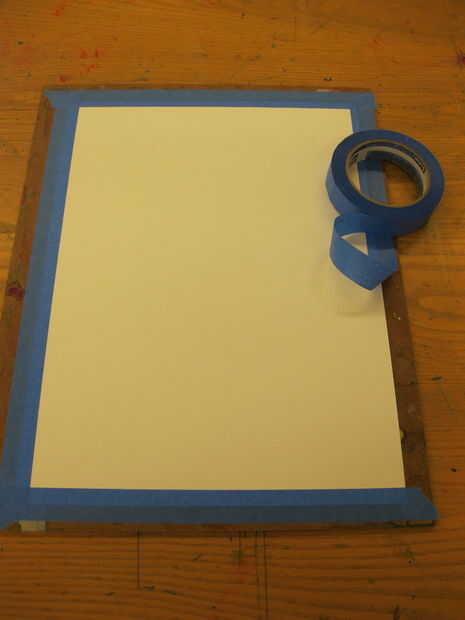 Cinta firmemente el papel de acuarela a la Junta. Cuando el papel se moja se estiran y se hinchan. Grabando a la Junta se encogen al secarse y secar plana.