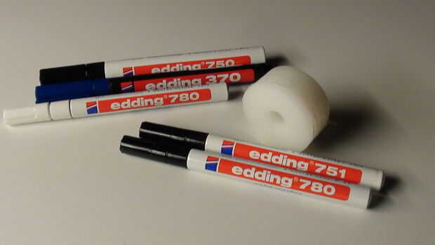 Un amigo subió con la idea de pintar el PCB a mano. Con la mano - tengo una máquina de CNC. Al día siguiente me comprado unas paintmarkers diferentes y atornille a mi CNC. Funcionó bien. Con el negro había una buena línea sin interrupciones.