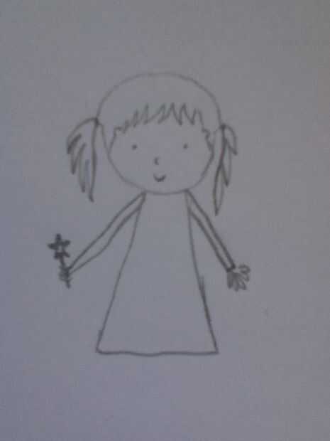 Dibujar el vestido a partir de la barbilla. Los brazos a partir de donde empieza el vestido, terminando con una mano sosteniendo la varita, la otra suelta.