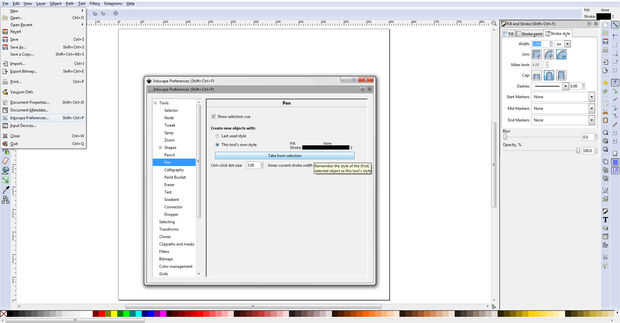 Si quieres que estos estilos de relleno y trazo que los valores por defecto cuando se abre a continuación el programa vas a archivo > Preferencias de Inkscape y seleccione "pluma" en el menú izquierdo. Debe haber un gran botón gris que dice "Tome de selección". Haga clic en el botón, y si ha tenido éxito deben leer las opciones relleno y trazo que aparecen encima del botón: