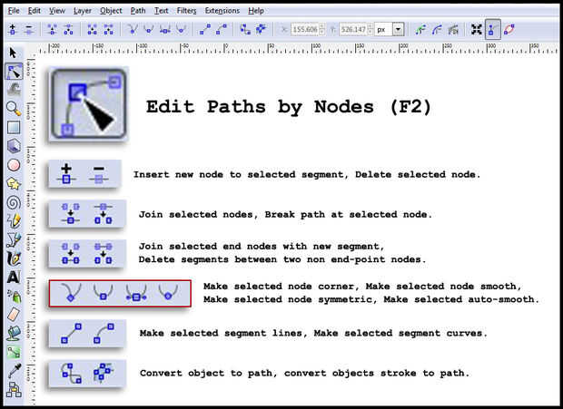 Utilizaremos la herramienta "editar trazados por los nodos" que es el segundo icono en el menú de herramientas izquierda. También puede acceder a él pulsando F2 en su teclado. Con esta herramienta seleccionada, la barra de menú en la parte superior ha cambiado de lo que se muestra al selecciona la herramienta anterior. Los iconos resaltados en rojo para esta herramienta de controlan de las características de los nodos que conforman las distintas formas y las líneas de nuestro dibujo. Usted puede elegir hacer los nodos (o puntos/puntos) agudo, suave o simétrico. Al crear una formas con la herramienta de curva a menudo tienes que volver atrás y cambiar la característica del punto en que comienzan y terminan para que sea una transición suave al cerrar la forma. Prometo que hará más sentido una vez que empezar!