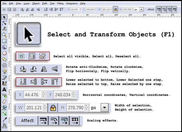 Usaremos la herramienta "seleccionar y transformar objetos" a moverse las cosas cuando queremos. Es el primer icono en el menú de herramientas izquierda. Se puede acceder en cualquier momento pulsando la barra espaciadora. También se puede acceder pulsando F1 en su teclado. Al seleccionar cualquier icono en el menú de la izquierda, la barra de menús en los mejores cambios para reflejar parte de lo que cada herramienta puede hacer. He marcado en rojo algunos de los submenús que utilizaremos en este tutorial. Si en cualquier momento desea conocer cualquiera de estas herramientas en el submenú, simplemente pase el cursor sobre el icono y presentará el título que debe dar una idea de lo que hacen.
