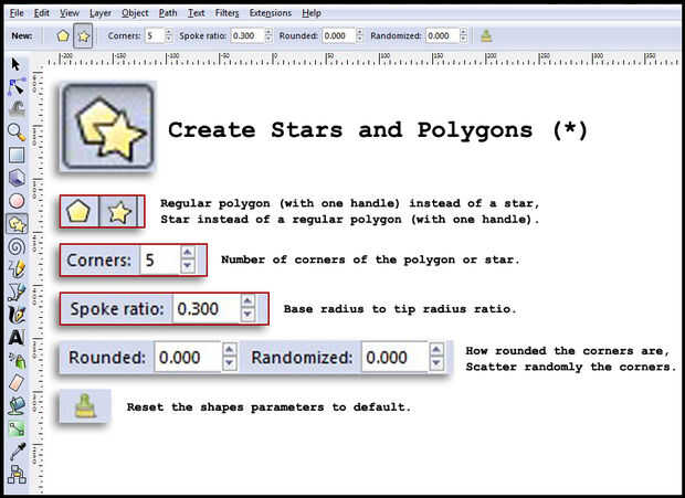 Para algunas estrellas para el cielo de noche con la herramienta "crear estrellas y polígonos" que es el octavo icono abajo en el menú de la izquierda herramientas creará un poco de diversión. Para acceder a esta herramienta, pulsando la tecla de asterix (*) en el teclado. Con esta herramienta seleccionada, la barra de menú en la parte superior muestra una opción entre crear polígonos y crear estrellas. Con la herramienta estrella seleccionada puede cambiar el número de esquinas/puntos que tiene su estrella, así como la relación de radios. Me gusta un tradicional estrella de cinco puntas y he marcado mi relación habló a 0.300. También puede cambiar cómo redondeados o que los puntos son creados - pero dejé en por defecto para este tutorial.