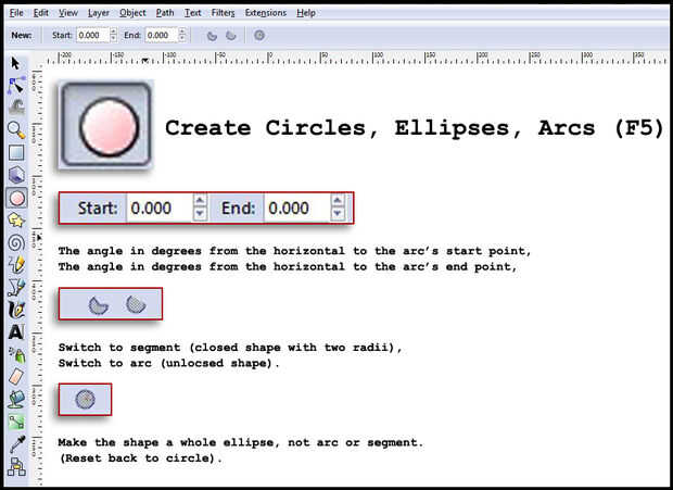 Usaremos la herramienta "Crear círculos, elipses, arcos" que es el séptimo icono abajo en el menú de herramientas izquierda. También puede acceder a esta herramienta pulsando F5 en su teclado. Con esta herramienta seleccionada, la barra de menú en la parte superior muestra las opciones para los puntos inicial y final de un arco. A cambiar estos parámetros para hacer la forma de segmento circular para la cabeza de gatos. Para volver a un círculo completo puede hacer clic en el último icono en la barra de menú superior para restablecer el círculo a la predeterminada forma closed.