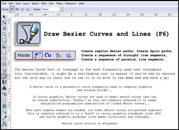 La herramienta "dibujar Bezier curva y líneas" en Inkscape será la herramienta más utilizada a lo largo de este Instructable. Es también conocida como la herramienta de "trazado" en GIMP o la herramienta "pluma" en Adobe Photoshop e Illustrator. Puede parecer una herramienta difícil de dominar si eres nuevo a trabajar con vectores y curvas pero la única manera de aprender a usarlo es bucear en el extremo profundo y tener un ir! La herramienta "dibujar curvas de Bézier" es el icono 11 abajo en el menú de herramientas izquierda. Parece un bolígrafo de punta fina. También puede acceder a él pulsando Mayús + F6 en el teclado.