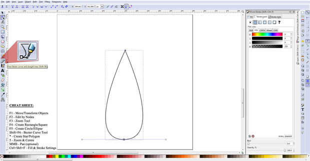 Activar la herramienta "dibujar curvas de Bézier" o pulsando en el icono en el menú de herramientas de mano izquierda o presionando shift + F6 en el teclado. Coloque el cursor sobre a medio camino a través de la página y un tercero de la manera abajo y haga clic una vez con botón izquierdo del ratón para empezar a dibujar la forma. Llevar el cursor hasta justo por encima de la parte inferior de la página en línea con el primer punto que acaba de crear, y esta vez en lugar de hacer clic una vez, usted tendrá que mantenga pulsado el botón izquierdo del ratón haga clic en y arrastre para dibujar los tiradores de los nodos. Cuando la curva se ve lo suficientemente largo, puede soltar el botón izquierdo del ratón. Para cerrar la jugada de forma el cursor de nuevo hasta el primer punto que creado y haga clic una vez. Ahora debe tener una forma cerrada que algo parecido a una lágrima.