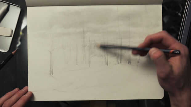 Al dibujar un cielo, ligeramente soy sombreado el área entera con lápices HB, y que el uso de una cepa de fusión para darle un efecto suave, suavizar los trazos de lápiz. Añadir las nubes es alcanzado fácilmente por borrar ciertas áreas y suavizar los bordes con la mezcla de cepas. Después de terminar con el cielo, seguir añadiendo más árboles y otros detalles que cubriré en el siguiente paso >