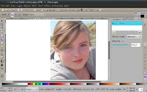 Para utilizar esta herramienta, escoja cualquier punto alrededor del contorno de la cara en la foto. Vas a trazar alrededor del contorno de la cara, luego rellena con un relleno de degradado en el color de su carne. Haga clic en el lugar. Esto hace detectar el comienzo de la ruta. Al final, se unirá hasta hacer un objeto. La herramienta Bézier dibujará una línea recta conectando la ubicación actual del ratón y el lugar que usted sólo hace clic. Así que mueva el ratón a otro punto cerca del punto de partida, alrededor de una pulgada lejos. Si usted tiene una pronunciada curva, hacerlo más cercano. Queremos mantener tanto el contorno como sea posible. Seguir haciendo esta en todo el contorno de la cara. Al llegar a la oreja (si es visible) sólo fingir que no está allí e imaginar lo que la cara se vea como debajo de la oreja y continuar. Al llegar el cabello, no sólo trazar la línea del cabello. hacer la cara que va a medio camino sobre el cabello (ver imágenes). Finalmente, conecte la última línea hasta el principio para hacer el objeto.