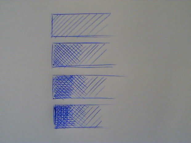 Vamos a tratar la luz y sombra con más detalle en el siguiente paso, pero para mejorar su dibujo es posible añadir una pequeña sombra usando una técnica llamada Cruz de la trama. Trama cruzada es una técnicas de la utilización de pequeñas líneas paralelas para crear zonas de tono. Generalmente se realiza en el alterno ángulos, 45 grados de una forma, entonces el otros, luego vertical y luego horizontal. Cada capa añade más tinta y oscurece más papel creando un tono más oscuro y más oscuro. Ver imagen.7 y image.8.