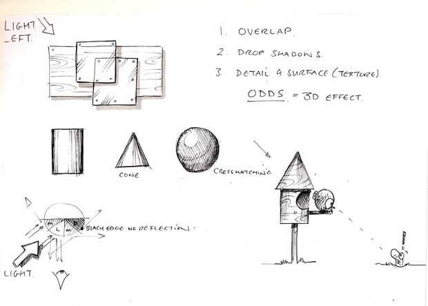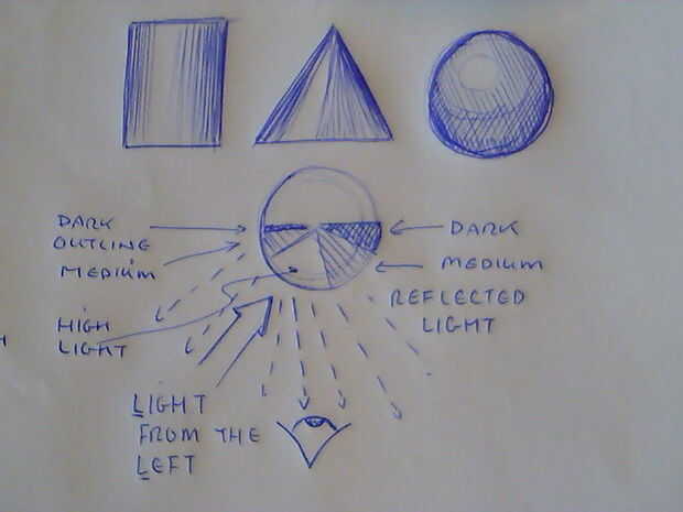 Imagen 17, 18 y 19 muestran cómo se puede utilizar sombreado para crear la ilusión de luz que incide sobre una superficie curvada por ejemplo un cilindro. Imagen 19 explica en más detalle. La luz cae sobre el objeto y se refleja algo de luz, donde la reflexión es directamente hacia el ojo de los espectadores, el espectador verá un punto culminante (luz). Donde la luz comience a caer lejos de la línea de la vista, menos luz refleja significa un tono más oscuro es visto (medio) y donde la luz no es reflejada hacia el espectador que tenemos muy poca luz lo que significa un tono más oscuro todavía (oscuro). Tan cualquier representación de un objeto necesita pensar en donde la luz brilla desde y donde están las reflexiones. En el diseño a menudo simplemente esto asumiendo que la luz brilla sobre los televidentes salimos de hombro. Luz de la izquierda.