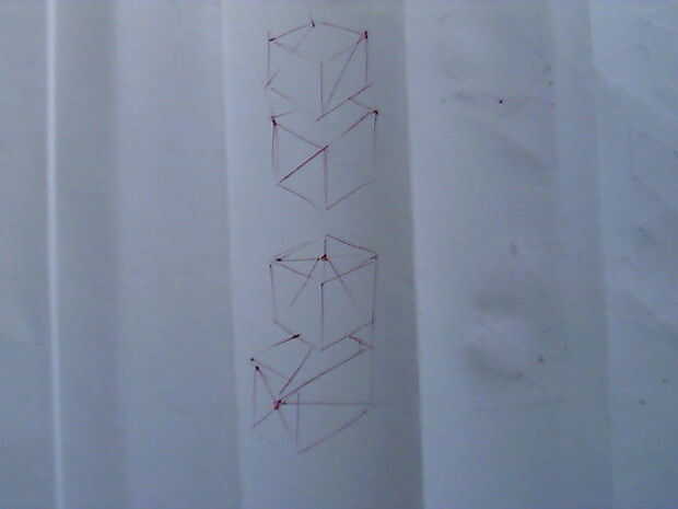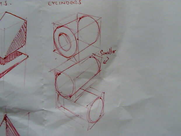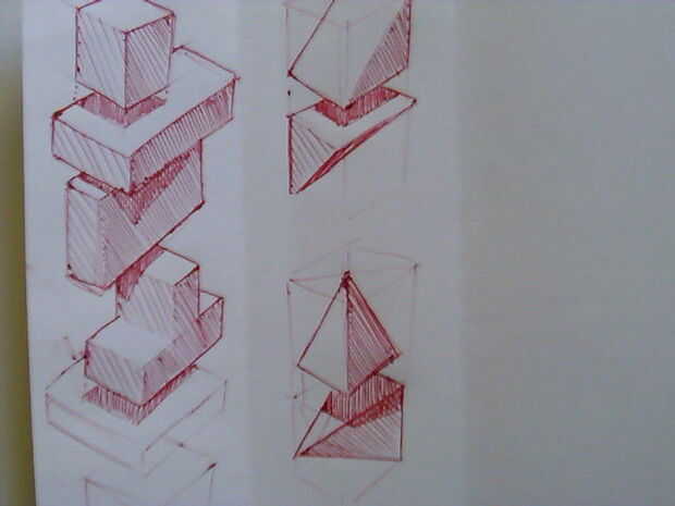 - Prismas se basan en cubos para que esboce cubos primero y luego el diseño del triángulo de elementos en las caras del cubo, las pirámides se construyen agregando una línea de esquina a esquina en una cara plana para encontrar un punto de centro que se une luego a la esquina opuesta de cara. Nota que he buscado y establecido fuera de la columna en primer lugar, ver imagen 22.