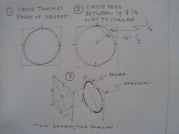 - Esta deconstrucción se puede reconstruir a una plaza cara plana 2D que ha sido dibujada en perspectiva. ver nota (3) que la elipse a diferencia de los círculos incluso cuarto forma la elipse tiene dos curvas más agudas y dos curvas poco profundas - sostenido de dos, bajo dos.