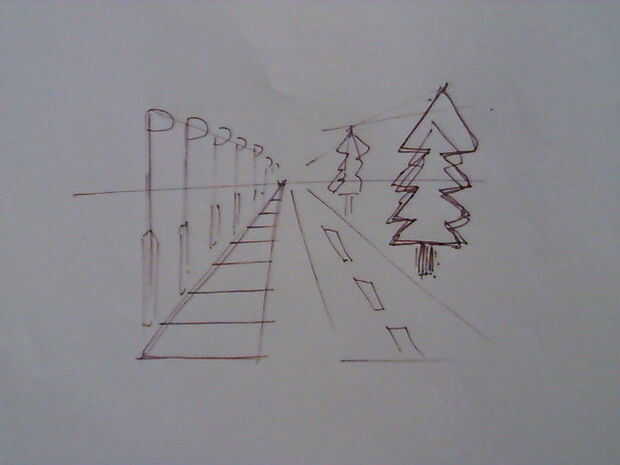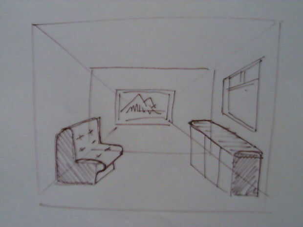 Cuando mira hacia abajo de un camino o una vía férrea de modo (del lado no el centro!) notará que las líneas que se apaga en la distancia parecen que se mueven más cerca juntos ( convergen) y como llegar al horizonte (línea del horizonte) se reúnen y desaparece (punto de fuga), ver imagen 2. Se trata de cómo vemos el mundo y cómo medir visualmente el tamaño y la distancia de objetos. Imagen 2 es un ejemplo de un punto de perspectiva - es un punto de fuga en que algunas de las líneas horizontales convergen. Es una útil técnica para diseño de interiores, ver imagen 3, pero tiene limitaciones cuando dibujo objetos más pequeños por ejemplo para el diseño de producto.