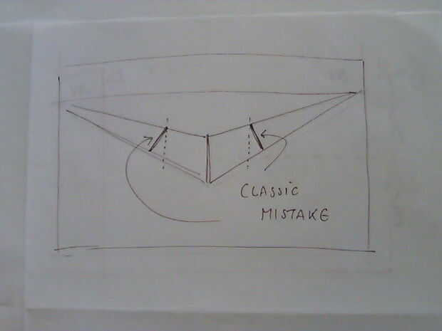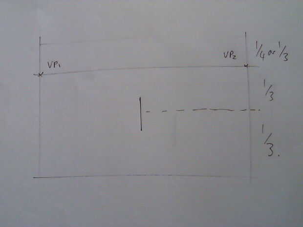 - Imagen 6 - ahora dibuja líneas verticales más [tener cuidado es que algunas personas hacen un error clásico ver imagen 7] y luego desde la parte superior de cada línea de nuevo muy débilmente esbozar una línea hasta el punto de fuga opuesto.