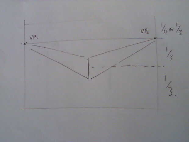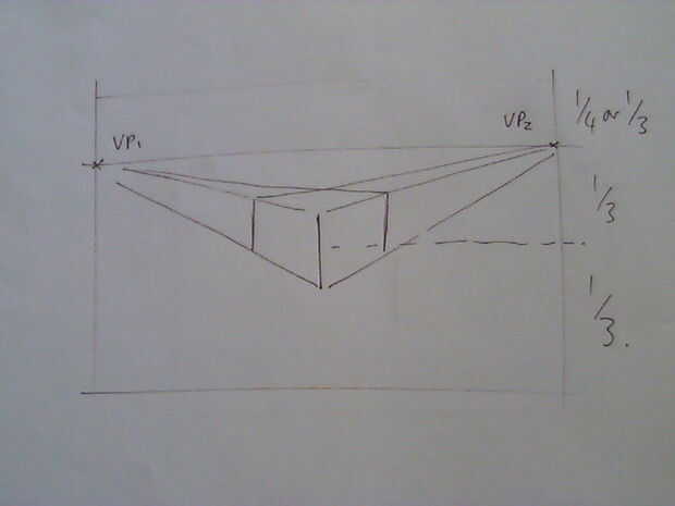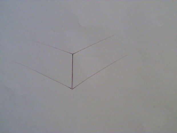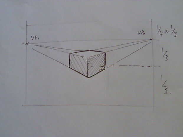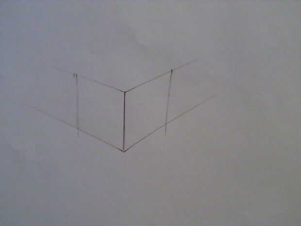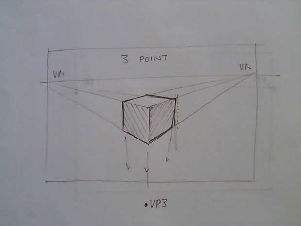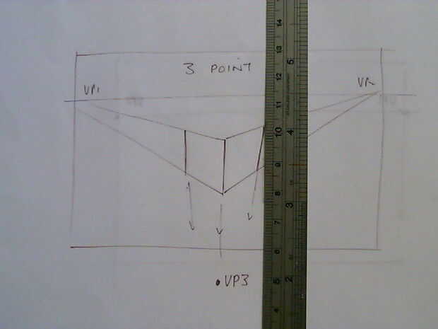 Tres punto de perspectiva, es muy similar excepto el paso 5. En vez de dos líneas verticales estas dos líneas convergen en un punto de fuga imaginario muy por debajo del borde inferior de la página, imagen 10 y 11. Este tercer tome punto en cuenta que cuando miramos un poco hacia abajo en un objeto, partes que están más lejos será todo así un poco más pequeña.