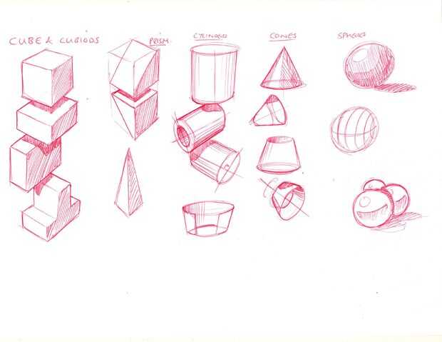 Las formas básicas son las formas 3D que actúan como los ladrillos de Lego de dibujo, una vez que ha dominado el básico forma le estará en su camino para poder dibujar casi cualquier cosa. Hemos introducido le al cubo ya pero hay otras 4 formas básicas de aprender.