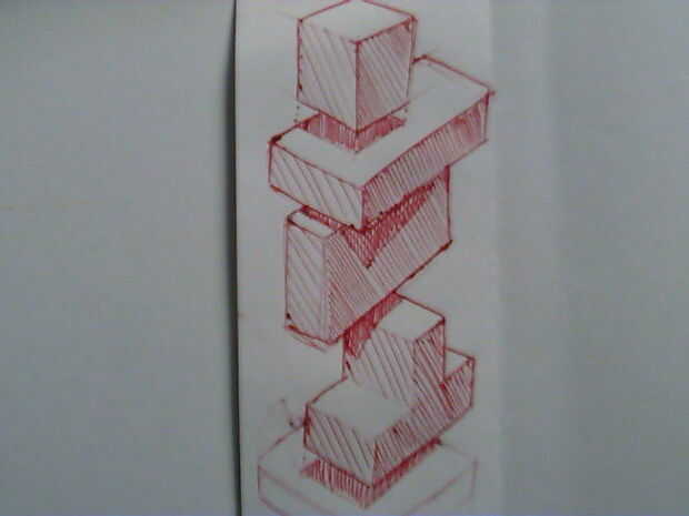 Observe cómo el ligero sombreado está representado en las caras superiores por ningún tono, en las caras a la izquierda por un sombreado diagonal abierto para crear un tono medio y en las caras a la derecha por una estrecha sombra diagonal para crear un tono oscuro. La sombra es un sombreado vertical muy estrecha para dar esa sensación de que baja desde arriba.