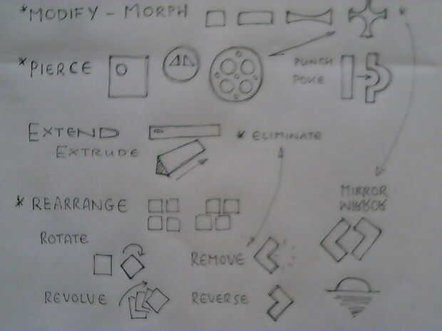 M - modificar, Morph, Mangle, Mush, puré, espejo - tomar elementos y dar nueva forma y vuelva a formar.