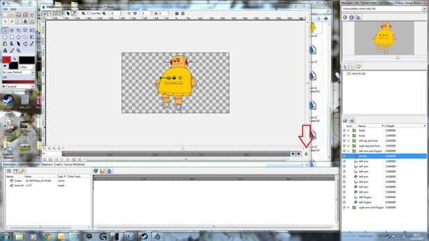 Haga clic en el hombrecito verde en la esquina inferior derecha del panel principal para iniciar la edición de animación. Cree un fotograma clave haciendo un movimiento muy pequeño del brazo. El triángulo dorado en la línea de tiempo muestra Cuándo se hace un fotograma clave.