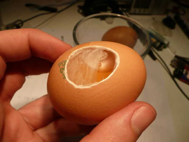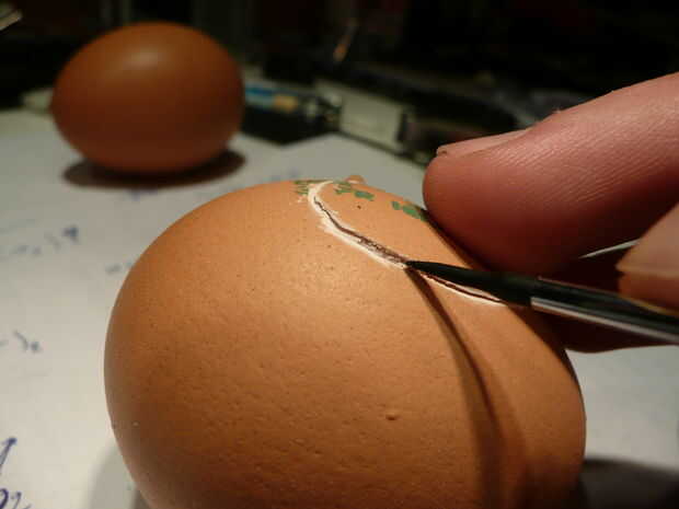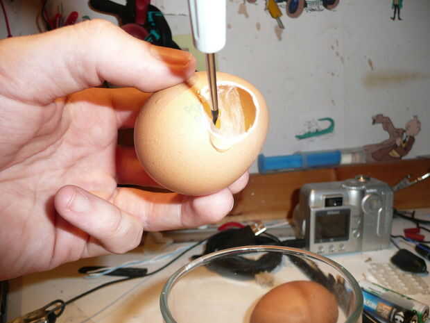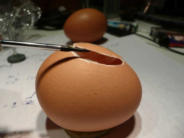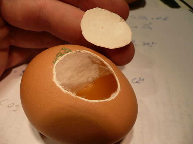 Puedes soplar entre amarillo y la cáscara o insertando un palo.