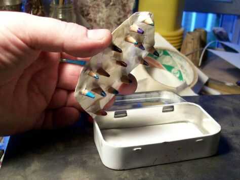 Corte un pedazo de papel a tamaño estaño y se coloca dentro. Poner la aguja en la parte superior. Cierre de la lata.