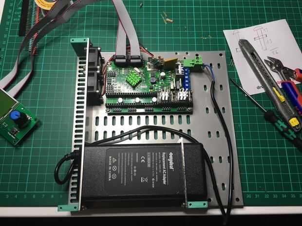 Con la llanura superior de 38mm dado, me hizo simétrica y utiliza la misma altura de 38mm para el compartimiento electrónico en la parte inferior. Necesitaba encontrar una fuente de alimentación que se adapta a interior y es capaz de ofrecer hasta 60W (para eso necesito 90W porque por regla general: no utiliza un desperfecto en el 80% o más de su tamaño). Todas las fuentes de poder industriales asequibles popular en el powersize necesario tenían demasiada altura de diseño. Y todos controllerboards tormento, como rampas o RADDS son de gran tamaño, también. El GT2560 y el mini AZSMZ han sido preseleccionados para el montaje.