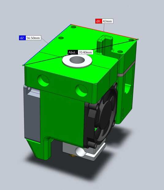 Con el cabezal de impresión compacto, se llegó a la buildvolume deseada de 8x8x8cm. Sólo cuando en la necesidad de enfriamiento de impresión, como para la impresión por ejemplo PLA o PETG, tengo que pasar en buildvolume de 5mm en el eje y. El coolingfan previsto anterior con su formato de 30mm no hace suficiente enfriamiento y tuvieron que mudarse para un más de gran alcance, pero el ventilador más grande con formato de 35mm. Si no necesita para el enfriamiento de impresión, un cambio rápido y sencillo trae el buildvolume completo.