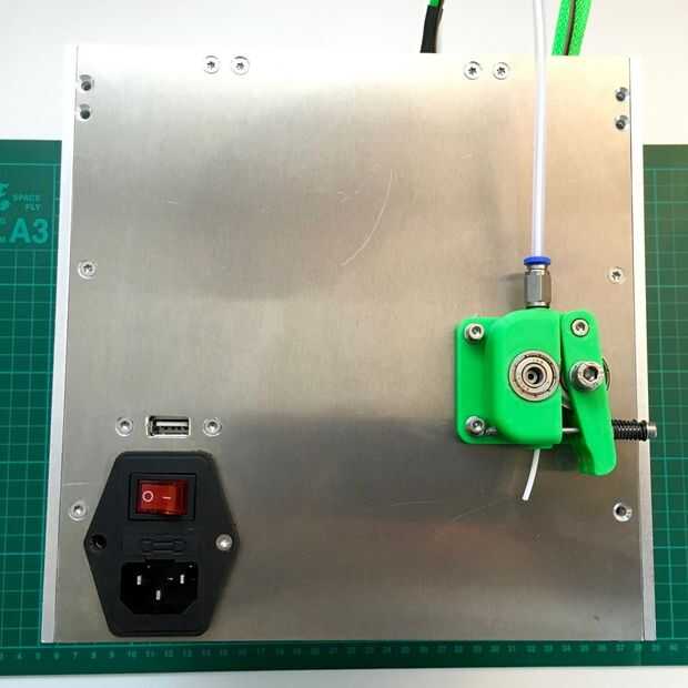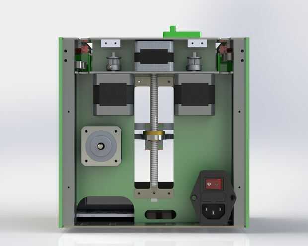 La parte posterior de los dados es exactamente 51mm de espesor. Este es el tamaño exacto NEMA17 montado necesitan para adaptarse, no más. Las hojas de contacto funcionan un poco como disipadores de calor adicional, los motores permanezca más frescos. Si usted mira de cerca, usted reconocerá que no hay ningún embrague en el eje z. Por razones de espacio, utiliza un motor con eje integrado, un TR8x4 debajo de los 3 motores para el X, Y y z es suficiente espacio para el extrudermotor y el enchufe de 230 v con interruptor integrado y fusible.