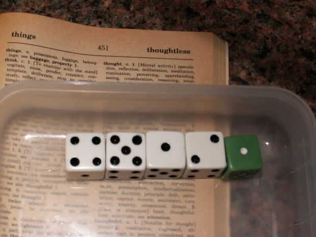 Así que para este libro termino rodando 5 dados en una caja de lápices de cada palabra que necesito. Una caja de archivo o una caja de zapatos funciona también, como los dados pueden alinear después usted hacerlas rodar.