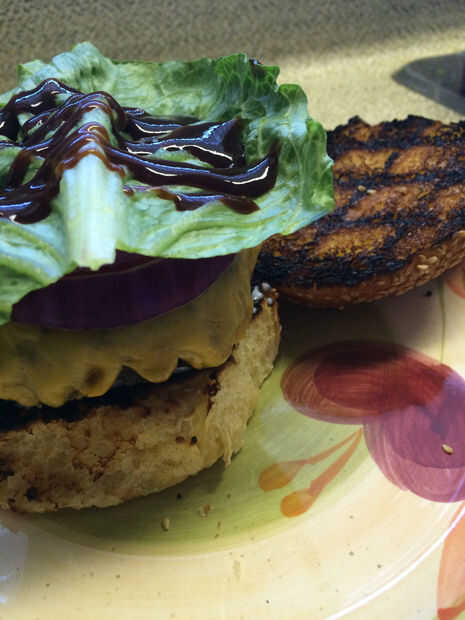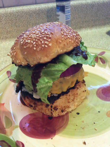 Una vez dentro quitar la hamburguesa de pan inferior y generosamente cubrir con la mayonesa de rábano picante y añadir la empanada de la hamburguesa. Agregar salmuera, tomate y cebolla morada y lechuga y salsa BBQ ahumado.